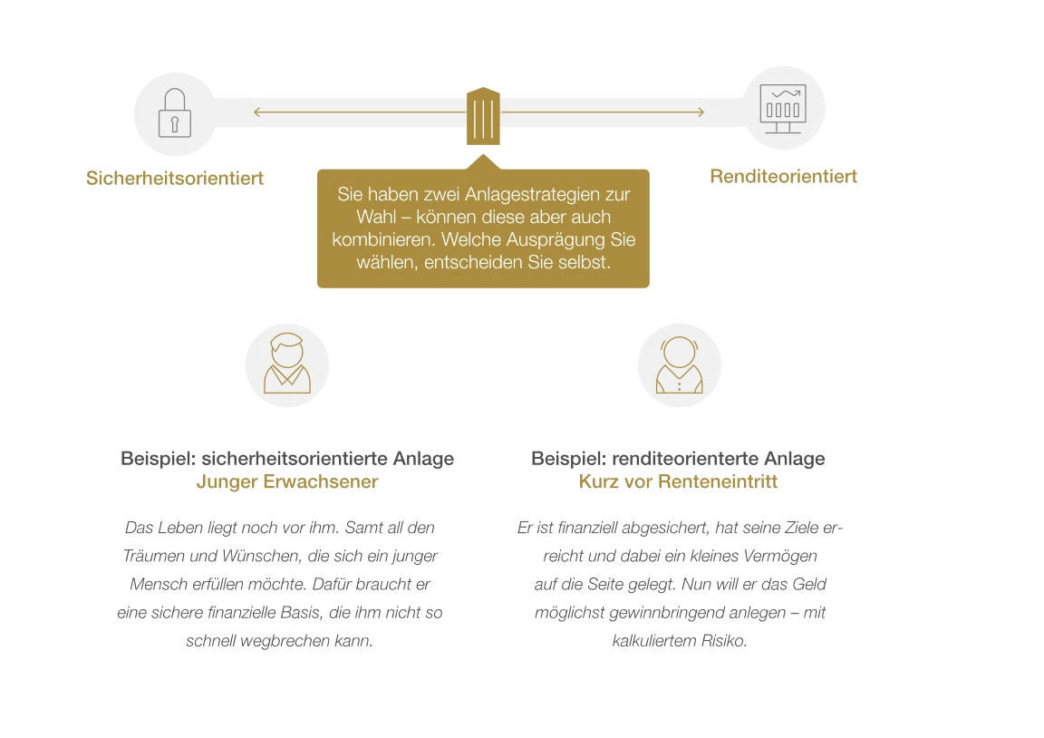 Angebot einholenSo individuell wie Ihre Wünsche ist auch die Wahl Ihrer Anlagestrategie. Denn Sie wissen am besten, wie sicher oder risikobereit Sie Ihre Anlagebeiträge anlegen möchten. Deshalb bietet Ihnen die RiesterRente STRATEGIE PLUS individuelle Flexibilität. Mit Hilfe des Schiebereglers gestalten Sie Ihre persönliche Anlagestrategie ganz einfach selbst mit. Und egal, wie Sie sich entscheiden, mit der Beitragsgarantie bei der RiesterRente STRATEGIE PLUS sind Sie auf der sicheren Seite: Zum Rentenbeginn erhalten Sie auf jeden Fall Ihre eingezahlten Beiträge zurück.