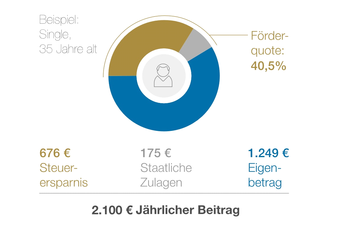 Single, 35 Jahre alt, Steuerklasse 1, Beitrag RiesterRente STRATEGIE PLUS auf Basis eines rentenversicherungspflichtigen VJ-Bruttoeinkommens von 53.000 Euro, Berechnung der zusätzlichen Steuerersparnis nach aktuell gültigem Steuertarif.
