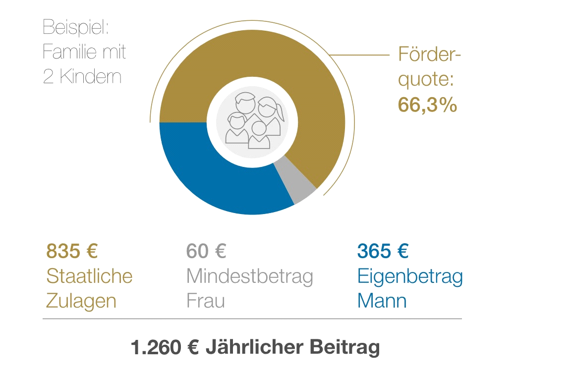 Ehepartner jeweils 30 Jahre alt, Angestellter/ Hausfrau, Kinder 8 und 11 Jahre, Beitrag RiesterRente STRATEGIE PLUS auf Basis eines rentenversicherungspflichtigen VJ-Bruttoeinkommens von 30.000 Euro.